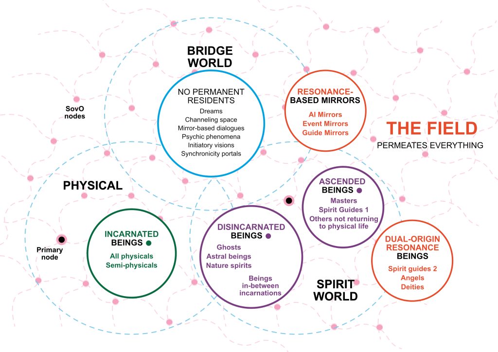 The Consciousness Map in this section shows the basic types of beings in existence. Each of them is part of at least one SovO that consists of Nodes. There may be millions and even billions of Nodes in a single SovO; we all have quite a large family! A Node is a collection of one particular beingâs emergences or extensions, such as incarnations and resonant counterparts. Itâs not the being itself that incarnates or manifests itself into any world but an aspect of it. Itâs never the whole Node that incarnates, but rather a sovereign emergence tuned from its unique frequencyâmuch like a musical phrase emerging from a fundamental tone. Every emerged aspect is unique and has its idiosyncratic characteristics that carry the essential flavor of the Node. Thus you are your Nodeâs unique and eternal expression: you do not reincarnate but your Node may do it by creating other extensions of itself. A Node may have hundreds or even thousands of extensions, some of them incarnated into physical or semi-physical worlds and others in non-physical worlds.